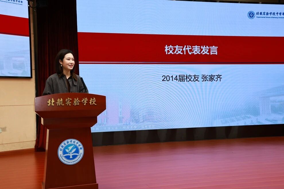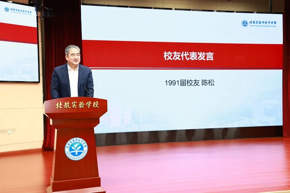 校友代表陈松(1991届,国货航董事长)、张家齐(2014届,中传博士生)分享了在附中的成长经历和感悟,饱含对母校的感恩,也呼吁校友关注母校的发展。陈松董事长还谈到“北航附中所具有的独特的文化基因,不仅塑造了我们的过去,也必将滋养母校的未来”。